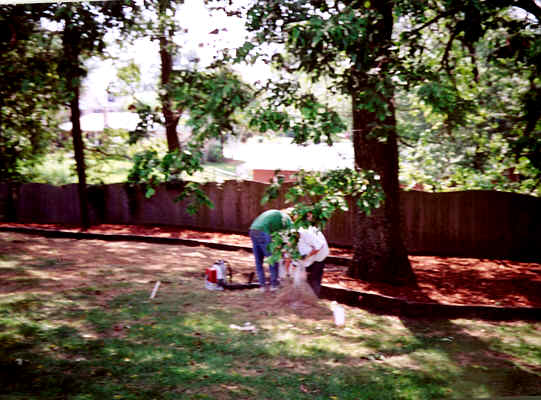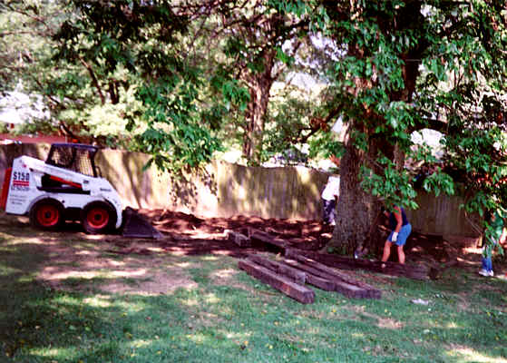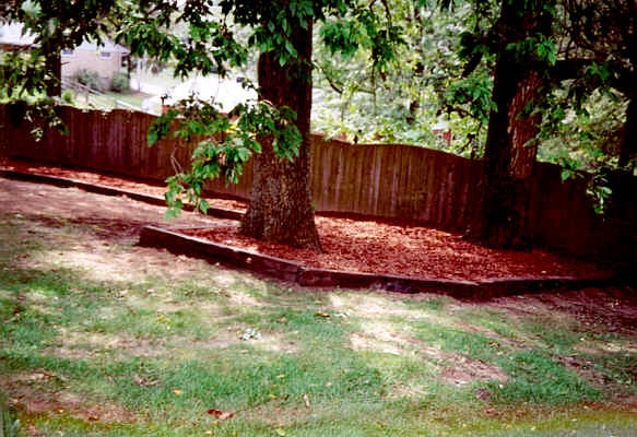 Railroad ties were chosen as a quick and econmical ($1/foot) edge for these raised beds in the backyard. 20 yards of ammended topsoil were used to fill the beds and a 3" layer of pine mulch laid on top.