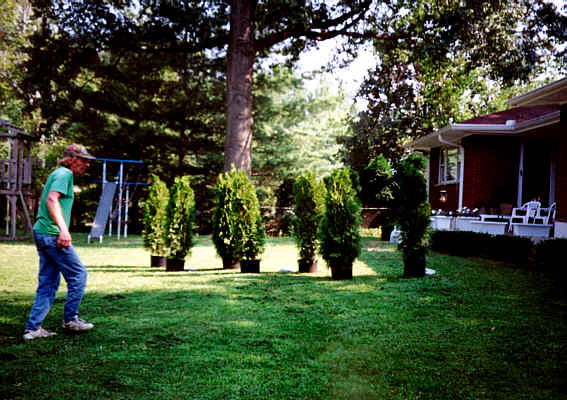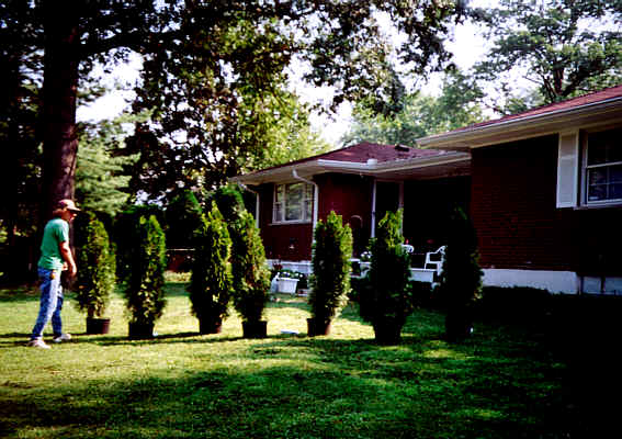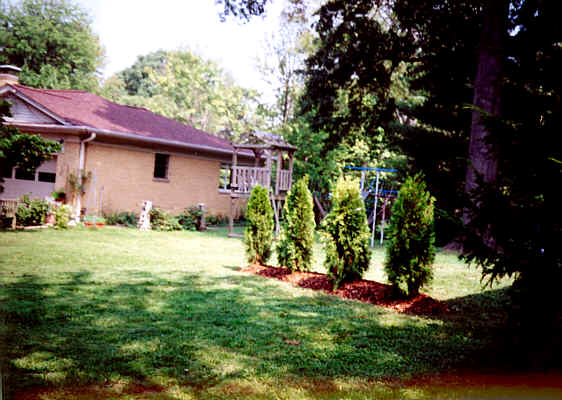 The view from the customers' patio. This planting will close in completely within two to three years and fully mature in 7. All steps were taken to make sure of quick performace.Ammended soil and 3-4" layer of pine mulch will insure maximum root and top development when the plants "flush out" next spring :) |
