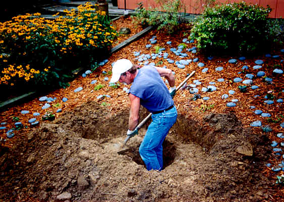 The customers wanted a water feature for the sound and ambiance. There were several laundry tubs sunk into the ground here when we started. They wanted a nice home for their new lotus plant so we created a small pond with a 30" deep center to accomosate the lotus and 12" deep side shelves for marginals. A small recirculating pump was also added for a soft rippling sound effect.
