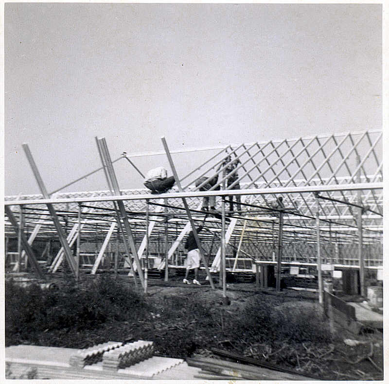 buildingagreenhouse01.jpg - 40's The final step in the process. Putting up a new house with expectations of the crops that will be grown in them! This one looks like the first house behind the barn on the Goetz place. Check out her shoes! But it just goes to show that everybody pitched in to make a range happen :) Broke my heart when then houses came down in the 80's. Best guess is that this is from just after the war..