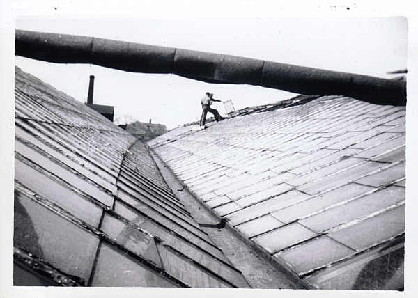 will&lesterontop.jpg - 40's Once built a glass greenhouse requires an enormous amount of maitainance. Exposure to weather and the intensity of magnified sunlight break down the glazing putty and paint. Wind can grab a vent like a sail and snap it from it's hinges. Here Will & Lester Goetz are repairing a vent.