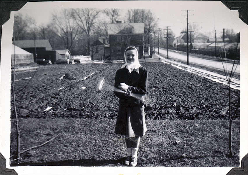 carolefunkesfront.jpg - Carole Funke (Coleman for the last what? 40 years?) in Funke's front yard twirling a baton. Notice the now HUGE Norway spruce in the Goetz yard has just been planted and the greenhouses at spring grove across the street. Since this was obviously taken in the 40's it has corrected my thought that Funke's front hot beds (technically cold frames) were installed in the early 1900's. Since they are not present in this picture and the front end is plowed for vegetables they were obviously put in much later. The young tree to Carole's left is the silver maple still in the front yard at our office. Bob told me he got this tree as one of the Arbor day seedlings given away in those days by the public schools. The tree give away I am told was sponsored by Mabley & Carew for Arbor day. Most years Funke's continues this tradition by giving away young evergreen seedlings on Earth day. This pic is from Helen's teenage photo album.