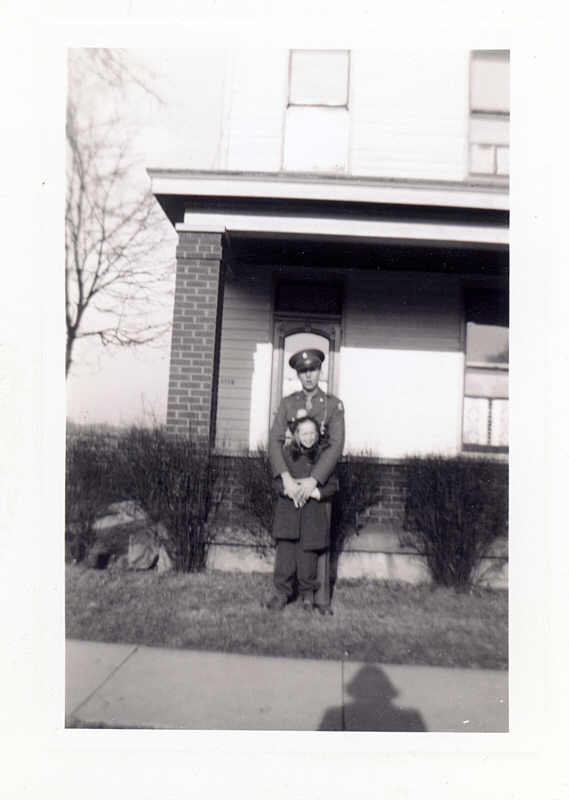 infrontofframe.jpg - Taken in front of the frame house on the Goetz place. The gardener boys did their part to preserve our freedom. Many served overseas to ensure that our way of life would be preserved at home. This is Ed Kattleman (husband of Louise Goetz) during WWII holding a young Helen. Louise's shadow is present in the foreground as the photographer.
