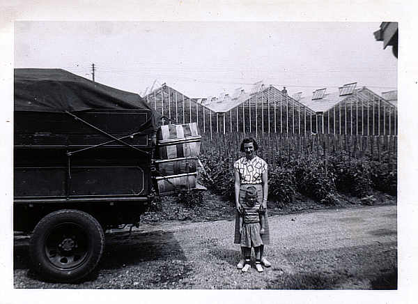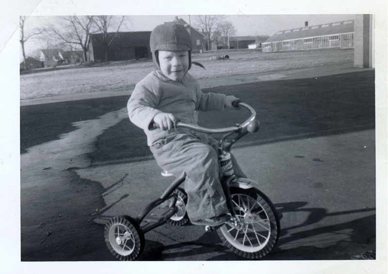 trike.jpg - 1961 or 62 A small red head in the Funke's yard on a favorite mode of transportation :) This picture shows the Wischmeyer Greenhouses which sat where our Side and rear nursery now stand. The foundation wall behind D3 was a part of this small four house range. The field in the background is our current parking lot and the barn across the field had been so poorly maintained that I took it down in the early 90's. The wood that could be salvaged became our windchime display.