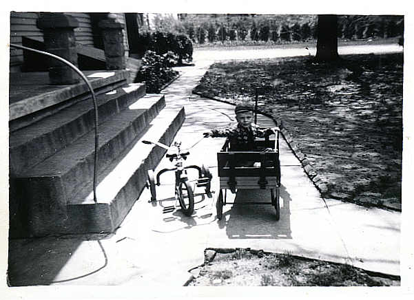 ralphwagon.jpg - The little red wagon has been a childhood favorite for many of us as it was for this happy little camper :) About 20 years after this picture was taken I showed up at these very same steps at about the same age as Ralph is in this picture with my little red wagon and some lettuce I'd just cut trying to sell heads for a dime apeice to my Uncle Harry :) Uncle Harry bought 7 heads.. 70 cents! wow! I was rich! hehe :) What a sweet man, he had about 15 houses full at the time :)