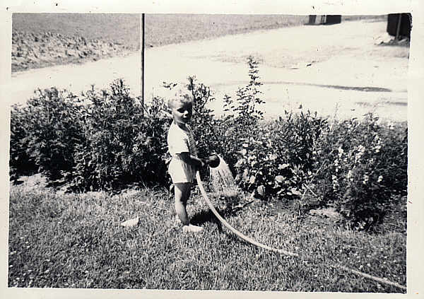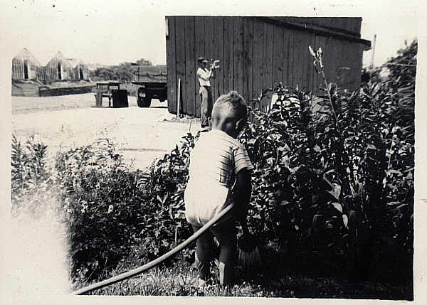 ralphwatering2.jpg - From an early age the children of the area learned the skills needed to become good growers. This picture and the following one inspired the name for this section. As in many of these pics the range in the background is Funke's. My cousin Ralph could never have imagined the foreshadowing these pictures present when he was watering Gramma's flowerbed :)