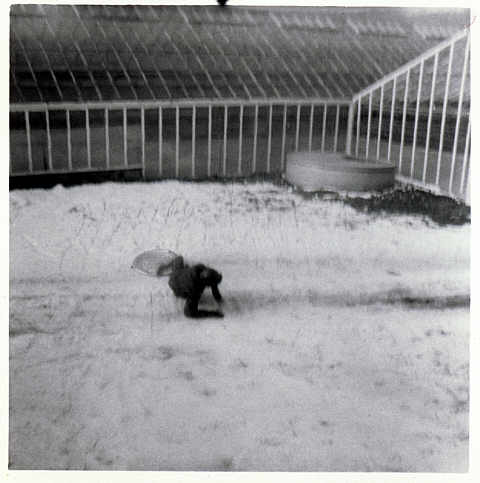 richosled.jpg - 1971 Rich Osterbrock partaking of a favorite pastime of the kids in this area behind the market shed on the Osterbrock place. Even Helen when viewing the pic with the bulldozer in the Building the future section reamrked how the hill they'd cut in that pic had been a slow but good sled riding hill :)