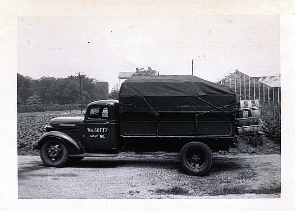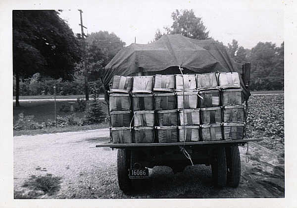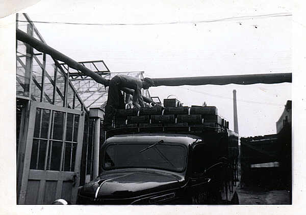 loadoflettuce2.jpg - A truckload of leaf lettuce packed and ready to go. Some of you that were around in the forties may have eaten some of it since this was often used as a bed for cottage cheese or added to sandwiches. The greenhouses in the background are our current front houses.