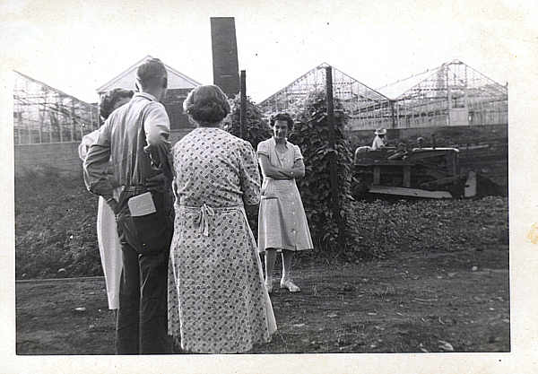 powwow.jpg - 40's A very traditional ritual :) At some point near the end of the day the folks on the farm would gather and discuss the day and what was the plan for tomorrow :) This picture shows Funke's boiler room and Rear glass houses much the same as they appear today.