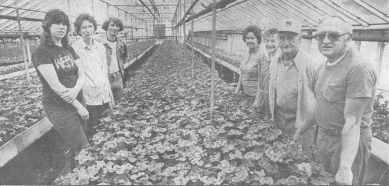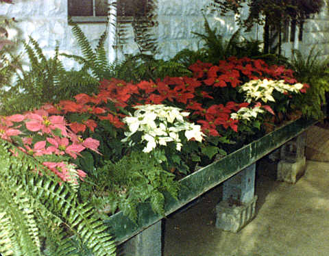 firstpoints.jpg - Some of our first poinsettias. I believe this pic was taken in 1979. This bench was where our current sales counter is today. For a peek at what this has blossomed into check out the winter page of the virtual visit!