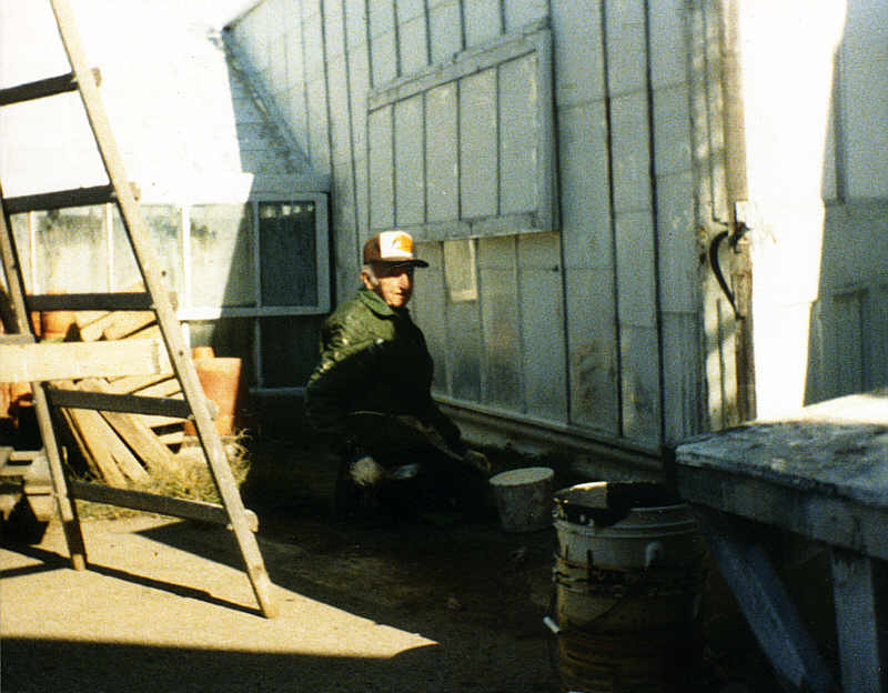 georgeatwork.jpg - George Funke in his mid 80's painting a sidewall of the greenhouses. This photo is from the late 1980's. George was truly a man who lived by the phrase "the harder I work, the luckier I get" :)