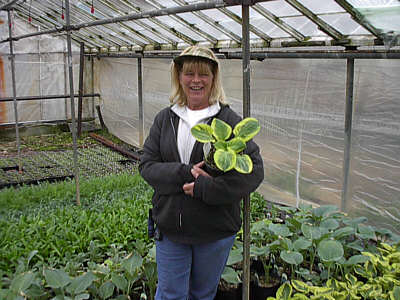 Joy Griesenger - Retail mangement & garden guru :) Shown here with her true love.. Hostas! With three decades of garden experience she's an expert in perennial gardening. Shade gardens are her specialty :) |
